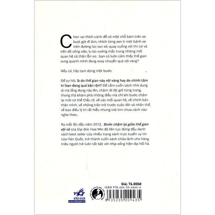 Ra mắt lần đầu năm 2012, Bước chậm lại giữa thế gian vội vã của Đại đức Hae Min đã liên tục đứng đầu danh sách best-seller của nhiều trang sách trực tuyến uy tín của Hàn Quốc, trở thành cuốn sách chữa lành cho hàng triệu người trẻ luôn tất bật với nhịp sống hiện đại hối hả.