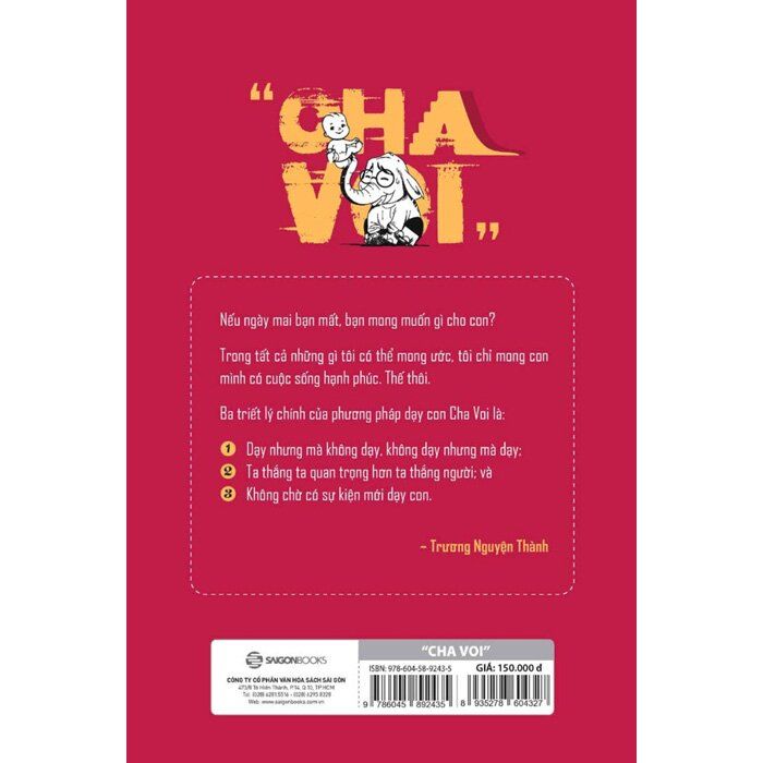 Cha Voi là phương pháp nuôi dạy con mà tác giả Trương Nguyện Thành đã áp dụng vào chính cuộc sống và cách nuôi dạy con của mình. Với phương pháp Cha Voi, cha mẹ có thể tạo ra các cơ hội hay tình huống rồi đồng hành để hướng dẫn con học những kỹ năng sống cần thiết qua trải nghiệm bản thân chứ không qua quy trình dạy dỗ thuần túy. Cha Voi không áp đặt suy nghĩ của mình lên con kiểu “Tại cha/mẹ nói như thế là không được thì là không được!” mà dùng những câu hỏi để chuyển hướng suy nghĩ của con theo chiều tích cực, tôn trọng ý kiến của con và tranh luận công bằng với con.