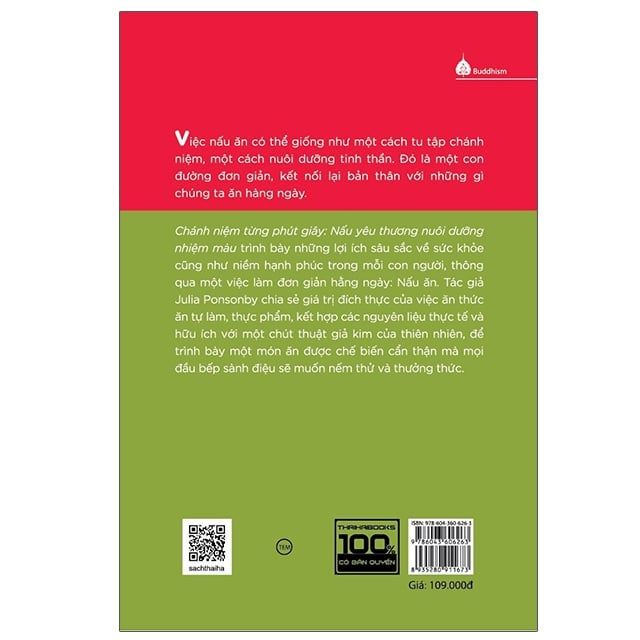 Cuốn sách nhẹ nhàng này sẽ giúp bạn hạnh phúc hơn ngay cả khi bạn đang nấu nướng. Khi thay đổi góc nhìn, tâm thế của chúng ta cũng sẽ thay đổi theo. Đây là cuốn sách nằm trong bộ “Chánh niệm từng phút giây”. Cuốn sách gợi mở những suy nghĩ mới về nấu ăn – một trong những hoạt động thú vị nhất mà chúng ta thực hiện mỗi ngày – như một cách tiếp cận có “chánh niệm” hơn với cuộc sống.