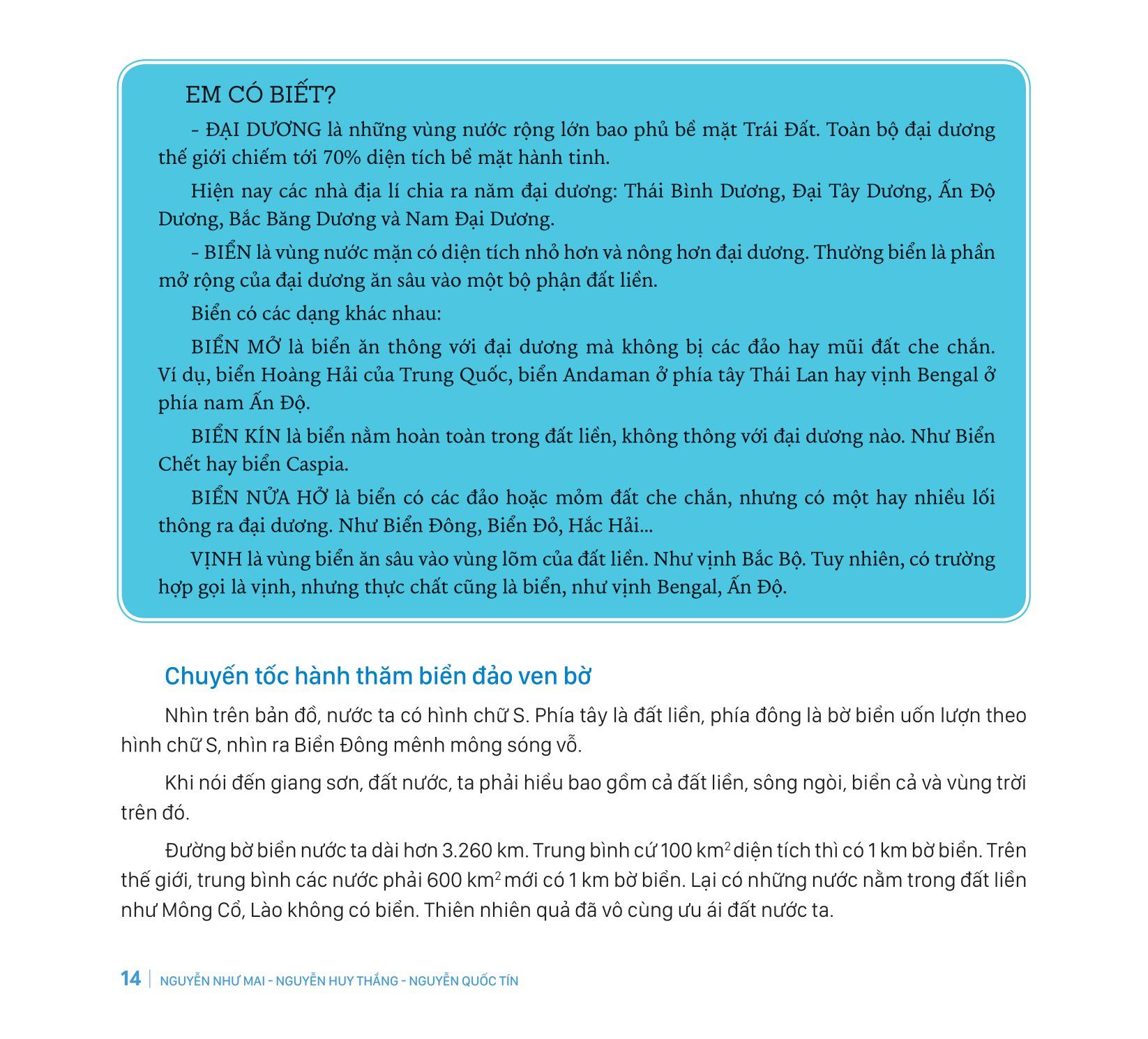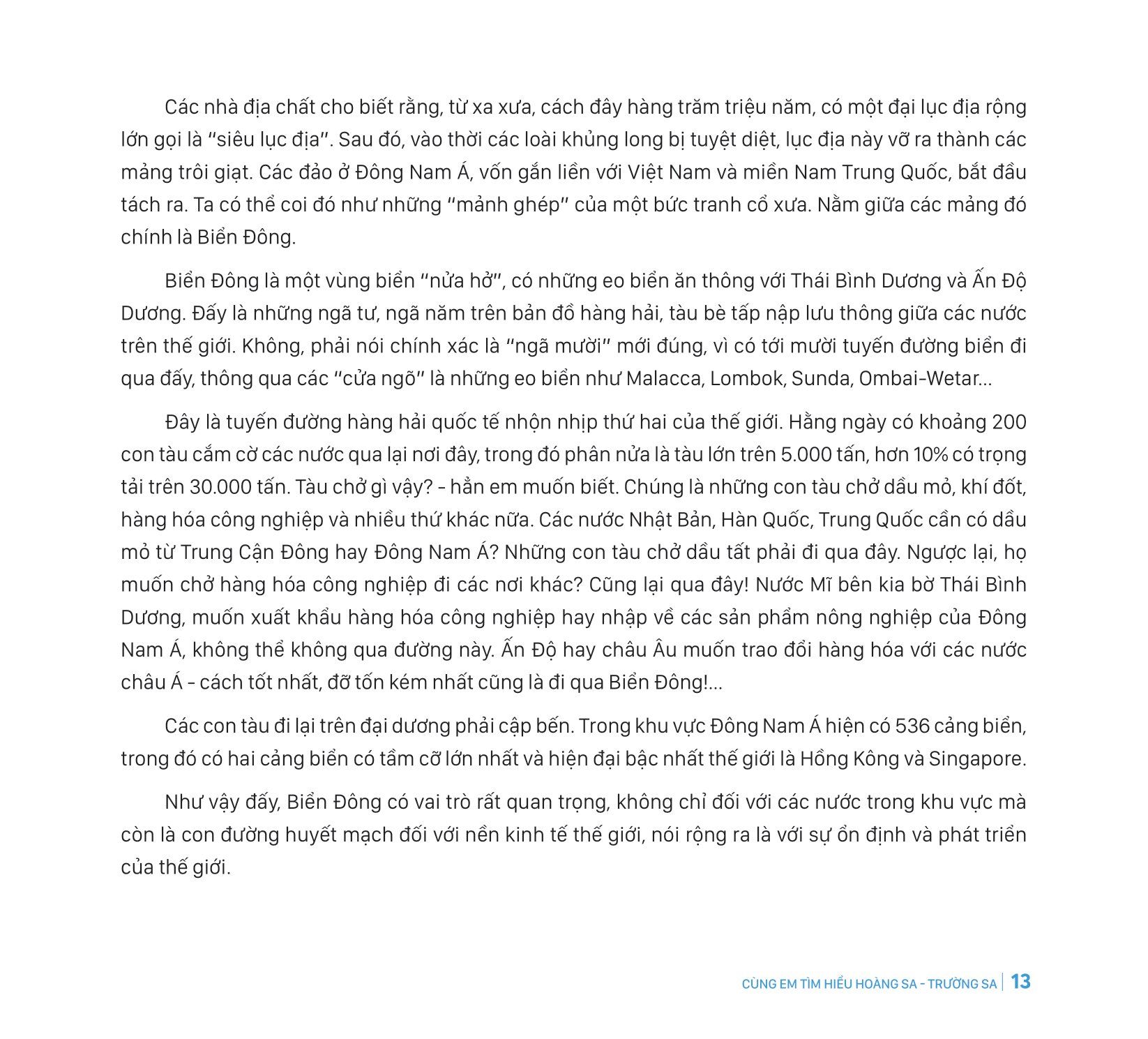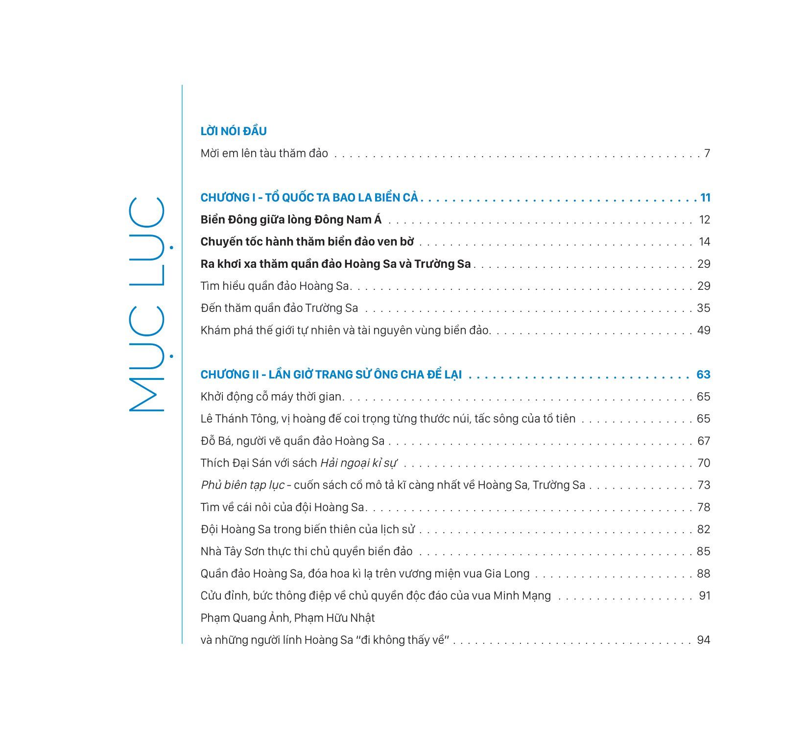 Cuốn sách này là con tàu tốc hành đi trong không gian đưa các em tới thăm các đảo và quần đảo trong vùng biển chủ quyền của nước ta và ngược thời gian tìm hiểu cha ông mình đã làm chủ và khai thác biển đảo như thế nào. Các em sẽ thấy tự hào với công lao của biết bao thế hệ người Việt Nam đã tạo lập và giữ gìn cả một giang sơn tổ quốc có lãnh thổ, lãnh hải đầy đủ chủ quyền. Từ đó các em sẽ yêu quý và có trách nhiệm với đất và nước thiêng liêng của quốc gia mình. Như Bác Hồ kính yêu đã nói trong chuyến đến thăm bộ đội hải quân tháng 3/1961: “Ngày trước ta chỉ có đêm và rừng, nay ta có ngày, có trời, có biển, bờ biển ta dài, tươi đẹp, ta phải giữ gìn lấy nó”.”