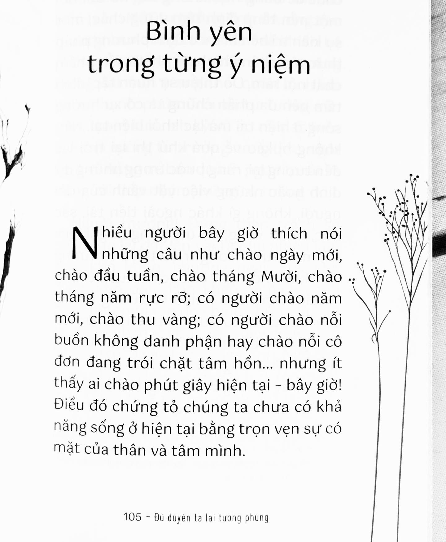 Bằng những chia sẻ mộc mạc, gần gũi xoay quanh đời sống thường ngày, được soi chiếu dưới triết lý nhà Phật, tác giả gửi gắm tâm nguyện mong mọi người đều có thể nhìn đời bằng ánh mắt yêu thương, bằng chánh niệm, bằng nhận thức rằng trong mỗi sát-na ngắn ngủi đều tồn tại sinh diệt, đều biến đổi không ngừng. Bởi thế mà quá khứ và tương lai đều không quan trọng bằng hiện tại. Hiện tại là nhất thời mà cũng là thiên thu nếu ta sống trọn từng khoảnh khắc.