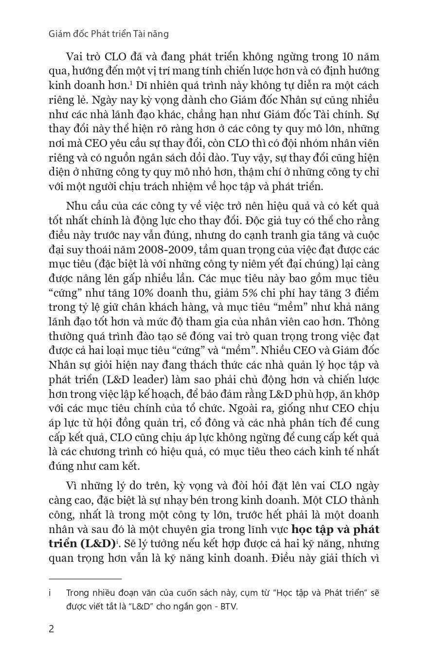 Cuộc cách mạng trong lĩnh vực HR và L&D - Sự chuyển hóa vai trò từ Giám đốc Đào tạo & Phát triển / Chief Learning Officer (CLO) trước đây thành Giám đốc Phát triển Tài năng / Chief Talent Officer (CTO) ngày nay Trước những thử thách và thay đổi nhanh chóng trong môi trường kinh doanh, học tập (learning) và tài năng (talent) là chìa khoá cho sự thành công của mọi công ty. Đây là lĩnh vực mà vai trò của Giám đốc Đào tạo & Phát triển (Chief Learning Officer - CLO) là vô cùng thiết yếu, và nó đã phát triển thành vai trò Giám đốc Phát triển Tài năng (Chief Talent Officer - CTO) trong các tổ chức.