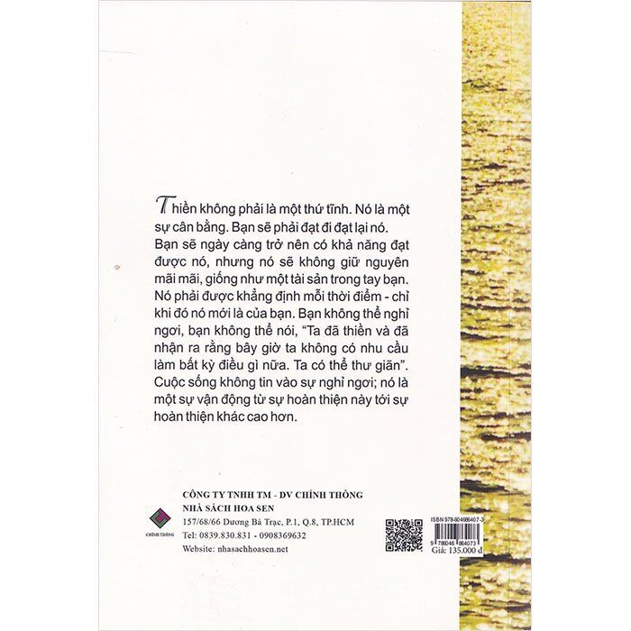 "Thiền không phải là một thứ tĩnh. Nó là một sự cân bằng. Bạn sẽ phải đạt đi đạt lại nó. Bạn sẽ ngày càng trở nên có khả năng đạt được nó, nhưng nó sẽ không giữ nguyên mãi mãi, giống như một tài sản trong tay bạn. Nó phải được khẳng định mỗi thời điểm - chỉ khi đó nó mới là của bạn. Bạn không thể nghỉ ngơi, bạn không thể nói, “Ta đã thiền và đã nhận ra rằng bây giờ ta không có nhu cầu làm bất kỳ điều gì nữa. Ta có thể thư giãn”. Cuộc sống không tin vào sự nghỉ ngơi, nó là một sự vận động từ sự hoàn thiện này tới sự hoàn thiện khác cao hơn."