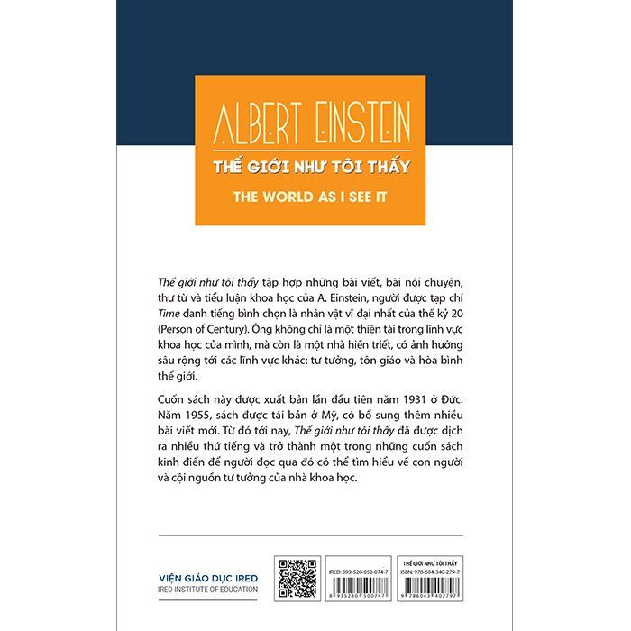 Nhà xuất bản: Tri Thức Tác giả: Albert Einstein Dịch giả: Đinh Bá Anh, Nguyễn Vũ Hảo, Trần Tiễn Cao Đăng Kích thước: 12 x 22cm Số trang: 196 Bìa sách: Bìa cứng ------------------- Thế Giới Như Tôi Thấy (Bìa Cứng)