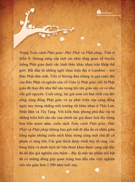 TrongToàn cảnh Phật giáo: Đức Phật và Phật pháp, Tiến sĩ John S. Strong cung cấp một cái nhìn tổng quan về truyền thống Phật giáo dưới các hình thức khác nhau trên khắp thế giới. Bắt đầu từ những ngôi chùa hiện đại ở Lumbini – nơi Đức Phật đản sinh, Tiến sĩ Strong đưa chúng ta qua cuộc đời của Đức Phật và nghiên cứu về Giáo lý Phật giáo, tiết lộ Phật giáo đã thay đổi như thế nào trong khi tôn giáo này có vẻ như vẫn giữ nguyên. Cuối cùng, tác giả xem xét bản chất của đời sống cộng đồng Phật giáo và sự phát triển của cộng đồng ngày nay trong những môi trường rất khác nhau ở Thái Lan, Nhật Bản và Tây Tạng. Với kiến thức phong phú đúc rút từ những hiểu biết sâu sắc của chính tác giả được tích lũy trong hơn bốn mươi năm, cuốn sáchToàn cảnh Phật giáo: Đức Phật và Phật phápkhông bao giờ mất đi dấu ấn cá nhân giữa hàng ngàn những cuốn sách khác trong cùng một chủ đề có phạm vi rộng lớn. Các giải thích được trình bày rõ ràng, các bảng biểu và danh sách tài liệu tham khảo được cung cấp đầy đủ để độc giả nghiên cứu thêm – đây là một tác phẩm nổi bật đã có những đóng góp quan trọng ban đầu.