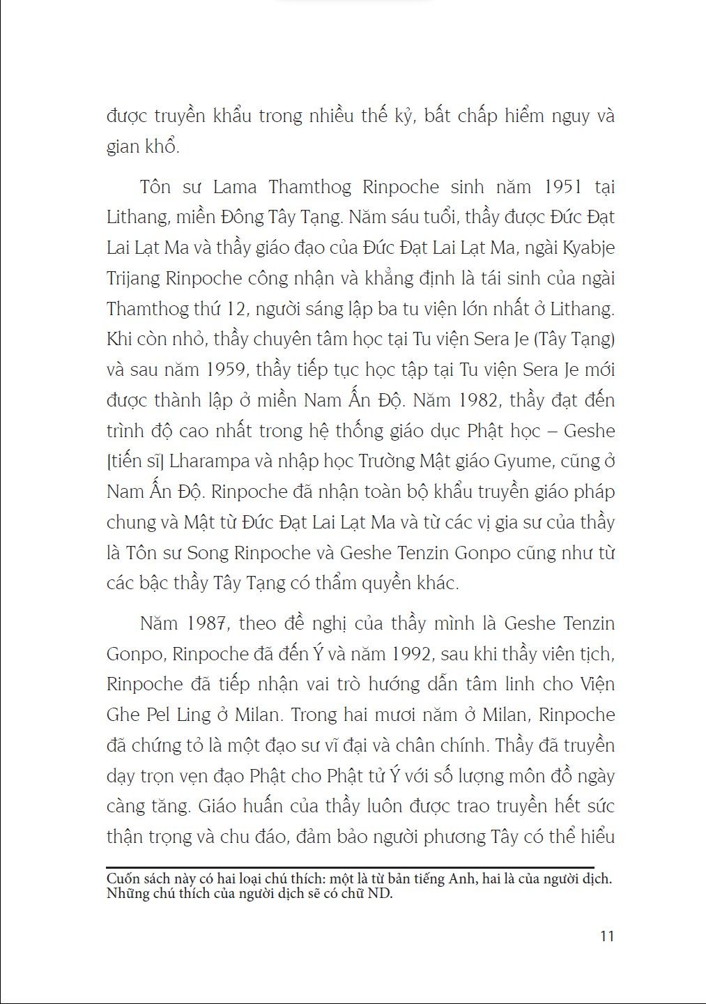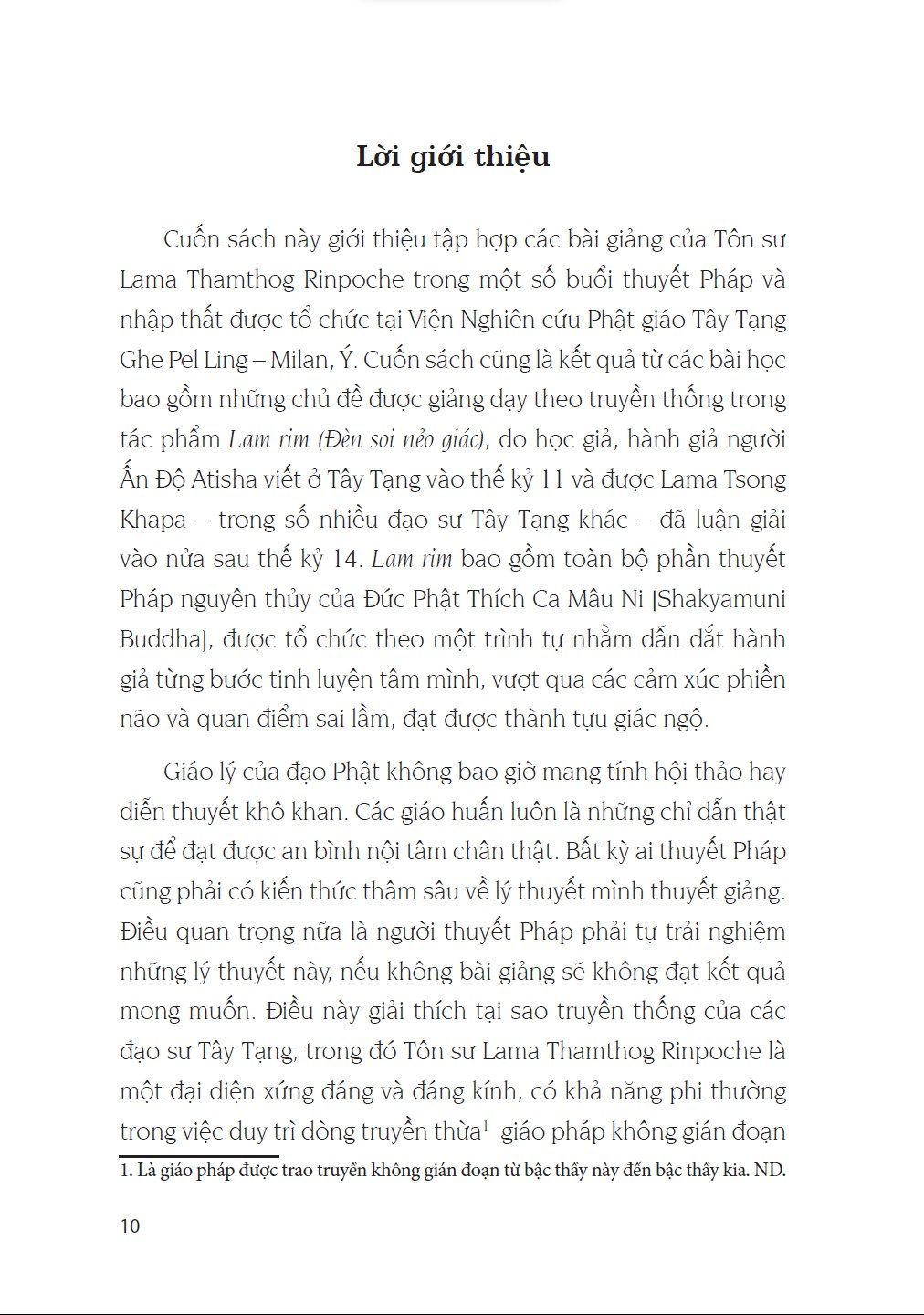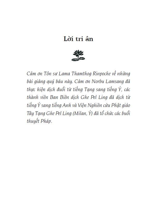Những điều chúng ta nghe được từ Tôn sư Lama Thamthog Rinpoche trong các buổi thuyết Pháp quý giá đó và có may mắn đọc ở đây, đến với chúng ta qua dòng truyền thừa thanh tịnh và trọn vẹn của thầy. Cuốn sách này bao hàm toàn bộ con đường từng bước đi đến giác ngộ được giải thích theo kinh nghiệm dày dặn và kiến thức uyên thâm của Tôn sư Lama Thamthog Rinpoche với sự thanh thoát mà chỉ có tiếp xúc trực tiếp với thính giả mới mang lại được. Những hướng dẫn này cho chúng ta thấy rằng, mặc dù đã xuất hiện từ hai nghìn năm trăm năm trước, đạo Phật vẫn đầy ý nghĩa thích hợp với tất cả chúng ta trong cuộc sống và trong xã hội ngày nay. -------------------- Thông tin tác giả: Tôn sư Lama Thamthog Rinpoche thuộc dòng tái sinh Thamthog. Thầy sinh tại miền Đông Tây Tạng vùng Lithang. Khi lên năm tuổi, giáo thọ của Đức Đạt Lai Lạt Ma – Trijang Rinpoche – đã nhận ra Thầy là Thamthog Rinpoche thứ 13. Thầy học triết học tại Tu viện Sera Je ở Lhasa. Giáo thọ của Đức Đạt Lai Lạt Ma, Ling Rinpoche đã ban giới Sa Di (tiếng Tạng là Getsul) cho thầy. Thầy cũng nhận Pháp từ Đức Đạt Lai Lạt Ma ở Lhasa. Những Pháp đầu tiên là lam rim và Kalachakra.