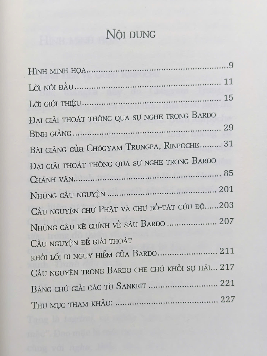 Mục Lục Lời Nói Đầu. Giới thiệu Đại Giải Thoát Thông Qua Sự Nghe Trong Bardo Bình Giảng Bài giảng của Chogyam Trungpa, Rinpoche Chánh Văn Đại Giải Thoát Thông Qua Sự Nghe Trong Bardo Chánh Văn Những Cầu Nguyện Cầu Nguyện chư Phật và chư Bồ tát Cứu Độ Những Câu Kệ Chính về Sáu Bardo Cầu Nguyện Để Giải Thoát Khỏi Lối Đi Nguy Hiểm Của Bardo Cầu Nguyện Trong Bardo Che Chở Khỏi Sợ Hãi Bảng Chú Giải Các Từ Sankrit Thư mục tham khảo