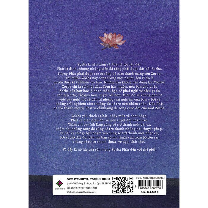 Zorba yêu thích ca hát, nhảy múa và chơi nhạc. Phật sẽ biến điều đó trở nên tuyệt đối hoàn hảo. Thậm chí sự tĩnh lặng cũng sẽ trở thành một bài ca, thậm chí những tảng đá cũng sẽ trở thành những bài thuyết pháp, và bất cứ thứ gì bạn chạm vào cũng sẽ trở thành một nhạc cụ, bởi vì giờ đây đôi bàn tay bạn có ma thuật của toàn bộ tồn tại; chúng có sự thanh thoát, vẻ đẹp, chất thơ và đây là nỗ lực của tôi: mang Zorba phật đến với thế giới.